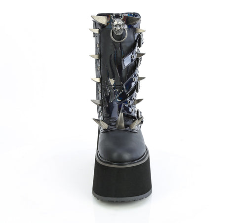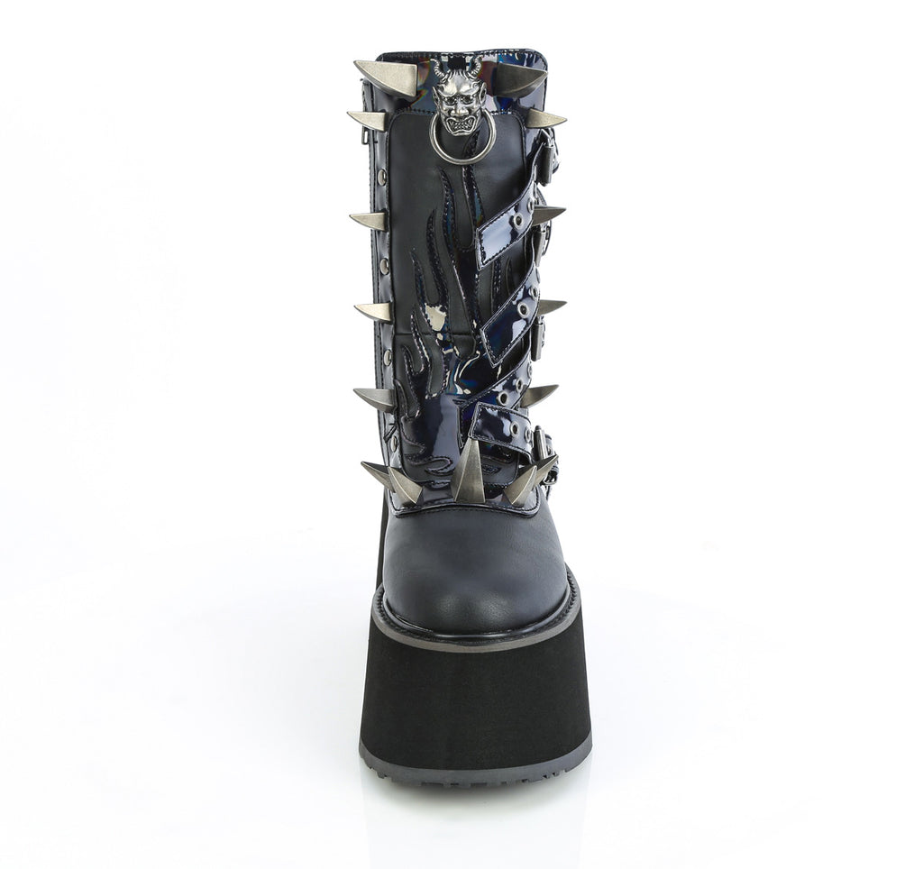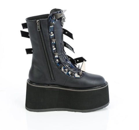 3 1/2" (90mm) Platform Mid-Calf Boot Featuing Belted Front Shield w/ Contrast Flame Design, Ornameltal Strapping and Gunmetal Claw Spikes & Devil w/ O-ring Ornament on Tongue, Inside Metal Zip Closure