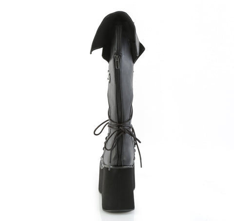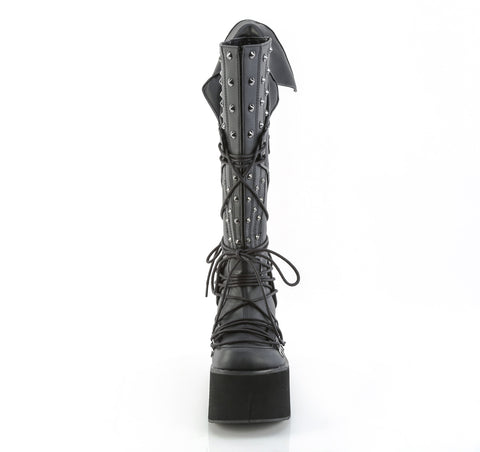 4 1/2" (114mm) Platform Knee High Boot Featuring Ornamental D-Ring Lacing, Collar & Cone Spike Stud Details Along with Front Gusset Stretch Detail in Front, Full Length Inner Side Metal Zip Closure